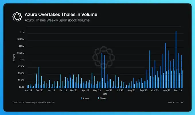 · 部署在 Polygon 和 Gnosis 链上的 azuro 尽管起步缓慢,但最近超越 Thales 成为交易量最高的 DEX 体育博彩。