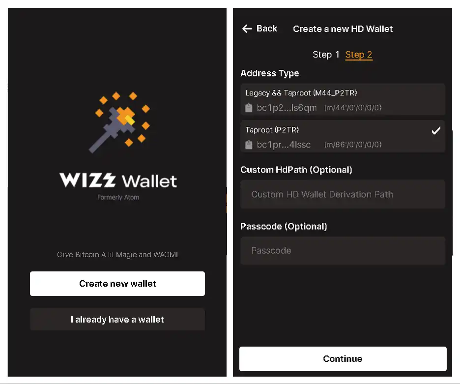 在 chrome 浏览器扩展程序中,打开 Wizz Wallet(Formerly Atom)插件。新用户在此界面选择「Create new wallet」(创建新钱包)。输入密码注册后会弹出 12 位助记词,备份助记词,选择后面为 m/86/0/0/0/0 的地址,点击「Continue」即可创建成功。