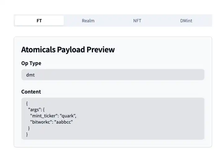 进入代打网站satsx,链接钱包后。在 Inscribe 页面中,左侧选择 Atomicals,FT 选项卡下选择 Mint,并在「Ticker」处填入「quark」。若需要由其他地址接收,则勾选「Receive by Other Address」(以其他地址接收),并填入新的地址。