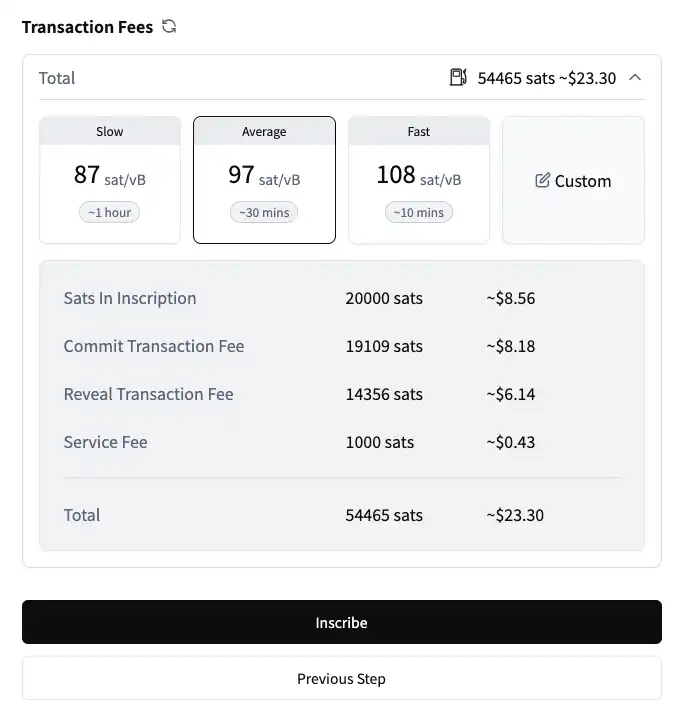 在「Transaction Fees」(交易费)中,根据当前比特币的 gas 费用,选择合适的费用,不同费用铸造速度不同,分别为 1 小时、30 分钟和 10 分钟。
