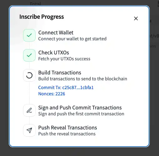 若代码信息出错可点击「Rrevious Step」(返回上一步)修改基本信息。信息确认无误,并选择完 gas 后点击「Inscribe」(铭刻),系统将会检查你的 UTXOs 以查看你是否有足够的资金。经过检查,UTXOs 充足后,将开始构建交易。