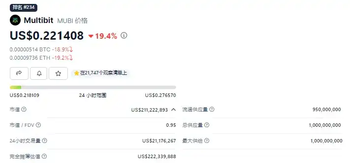 拍卖当天,在 ERC 20 进行的拍卖部分,在拍卖开始不到一分钟时间就完成了 88 ETH 的筹款目标。在 BRC-20 进行的拍卖部分,在拍卖开始后 30 分钟内完成,共募集了 4.64 BTC。并且,当日最高涨幅超过 2000% , 24 小时交易量达到 1500 万美元。目前,MUBI 已超过 2.1 亿美元(如下图)。