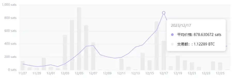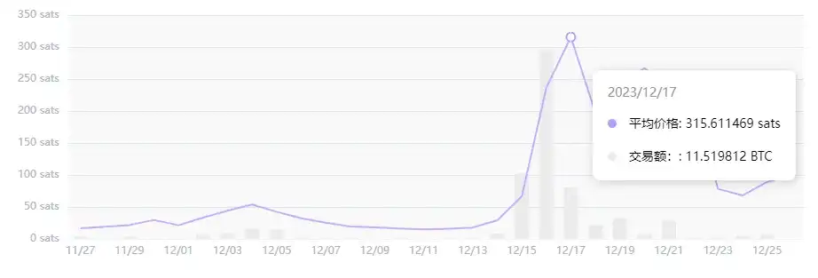 关于发售,其 NHUB 为 Free Launch。其最高价格达到 115 Sats,目前为 57.4 Sats,当前市值约为 300 万美元。