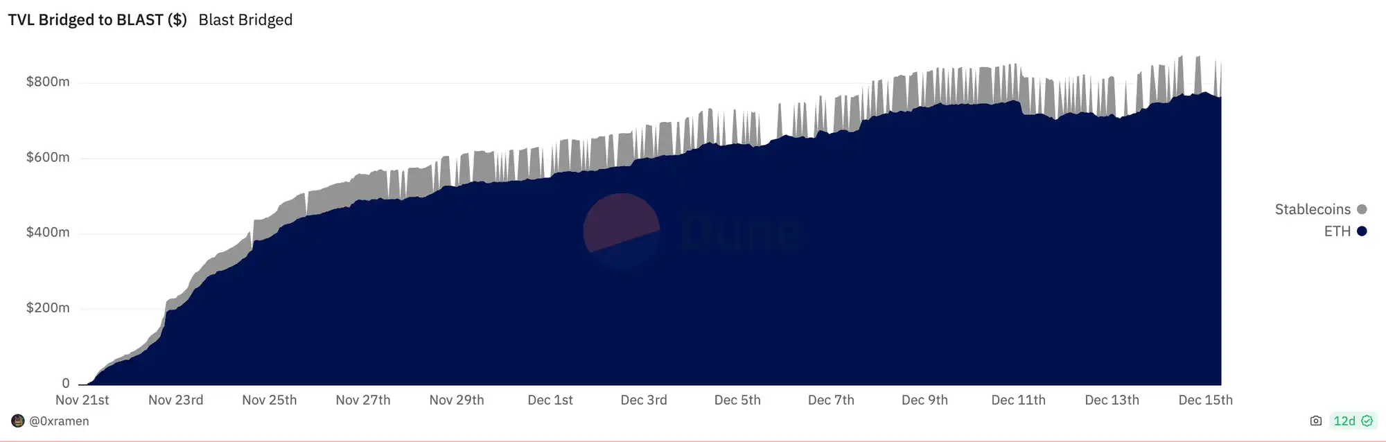 Blast 是一个 Layer2 网络,由 Blur 创始人 Pacman 推出。基于 Optimistic Rollups 技术,Blast 与以太坊兼容,为开发者和 dApp 提供了便利的接入方式。Blast 的 TVL 和用户数目的快速增长相当引人注目,目前 Blast TVL 已经来到 10 亿美元。