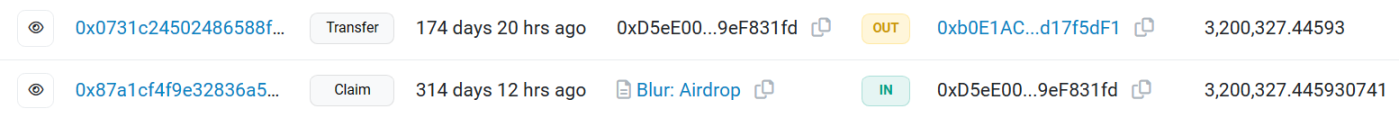 今年 2 月,Blur 向满足其空投条件的 62000 多个地址进行了总量 3.6 亿枚的 BLUR 代币空投,其中领取最多的单一地址,领了 320 万枚 BLUR,按照今天市价来计算,约 160 万美元,合 1000 万元。