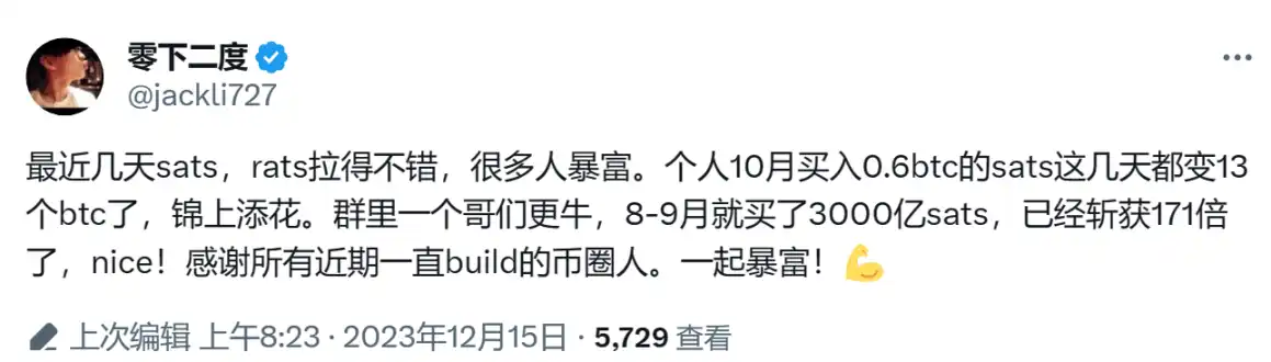 按推特用户零下二度分享,他个人在 10 月份花 0.6 BTC 买入的 SATS,历经 2 个月翻了 20 多倍,达 13 枚 BTC。