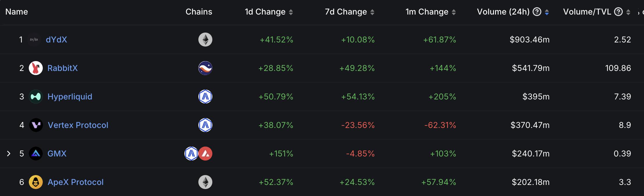 根据 DeFi Lama 的最新数据,RabbitX 目前是第二大链上衍生品交易平台,仅次于 dYdX。