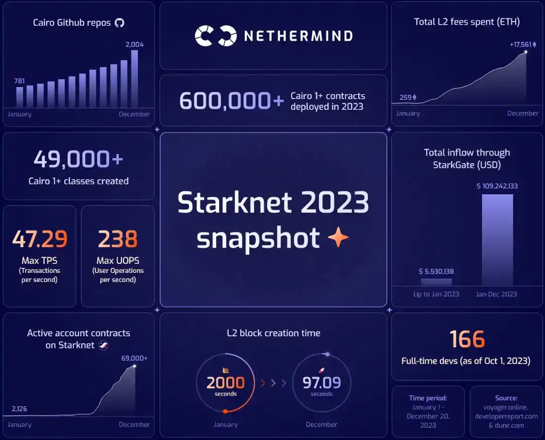 在加密货币的熊市中,Starknet 潜心做事,这一年来取得了相当大的进展。我们可以从 Nethermind 的行业回顾中,看到 Starknet 在过去的 2023 年相关指标的提升:
