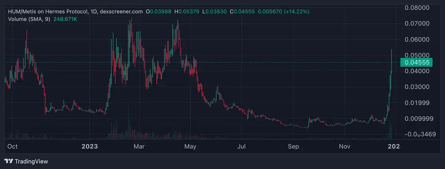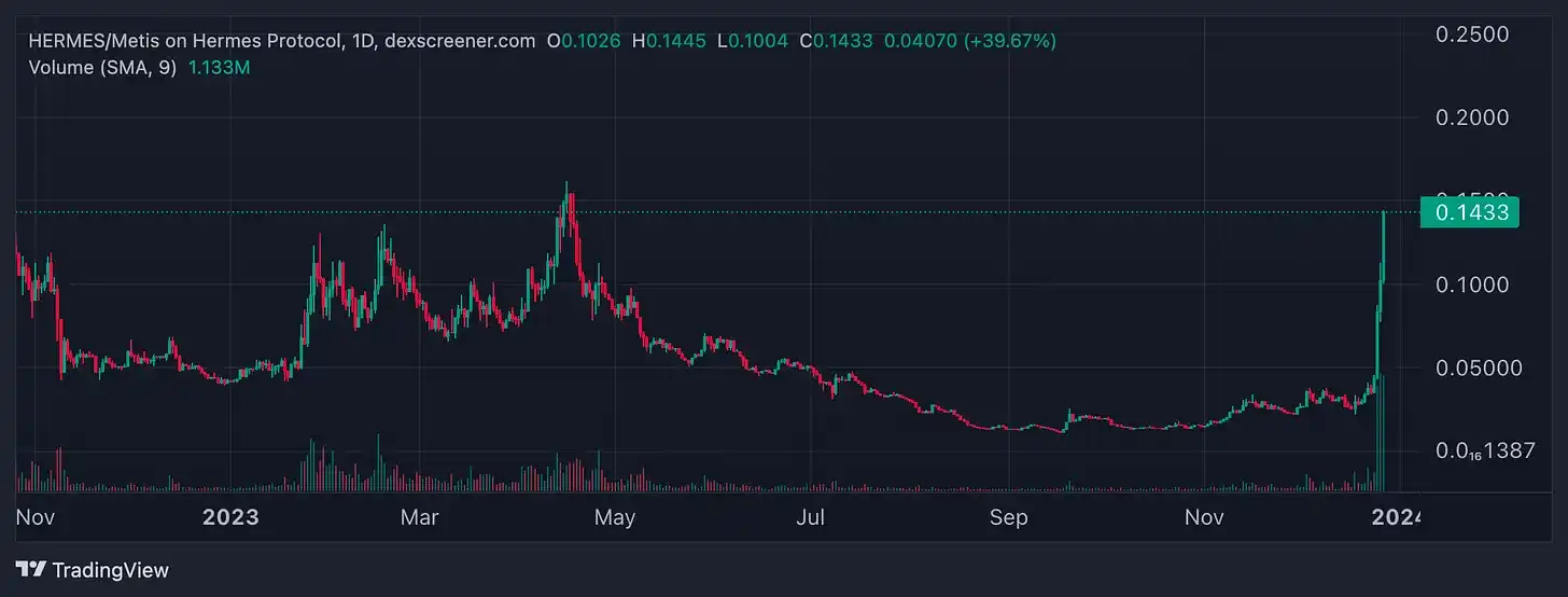 Hermes 是 Metis 上最著名的协议之一。我之前已经详细介绍过 Hermes,所以请参考我的文章:《介绍 Hermes 协议:Metis 领先的 AMM DEX》Hermes 协议是 Metis 的主要 AMM DEX,基于 Solidly Fork。它于 2022 年 3 月推出,允许 Metis 用户提供流动性,添加新指标、提高指标收益率、对代币发行进行投票以及收受贿赂。Hermes 基于 Andre Cronje 的「费用激励机制」:每次交易发生时,LP 从排放中获得 HERMES,而费用则转给投票给该池的 Stakers 和 Lockers,从而解释了高年利率。该协议将受益于 EDF 基金以及即将推出的 V2 版本,其中引入了多项改进:特别是全链流动性、租赁流动性和收益市场。这些期望反映在最近的价格上涨中。然而,市值为 1000 万美元的 Hermes 仍然是相对较小的市值。