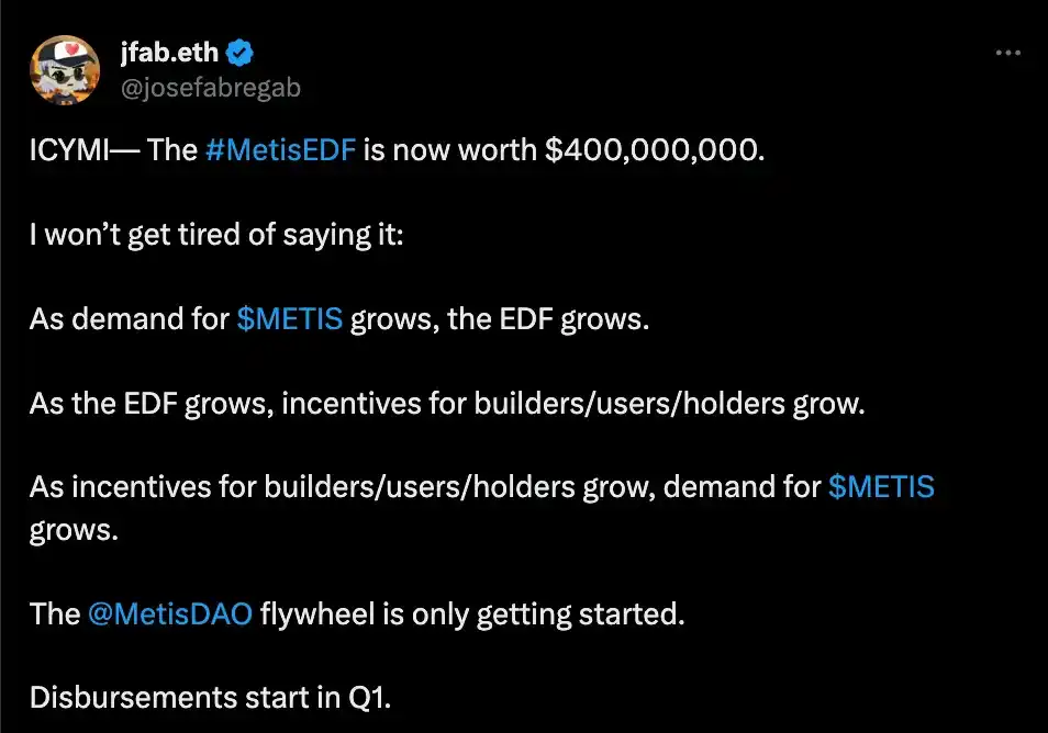 12 月 18 日,MetisDAO 宣布成立 Metis 生态系统发展基金(Metis EDF)。