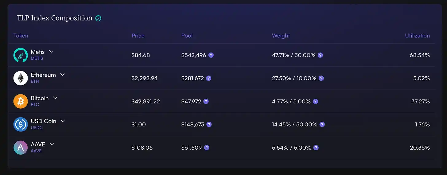 Tethys 是 Metis 上的一个永续 DEX,允许用户高达 50 倍的杠杆。Tethys 基于 GMX 模型,采用双代币模型,允许用户自己对抗其他交易者开仓。TLP 指数遵循 GLP 蓝图,但其指数中没有很多稳定币: