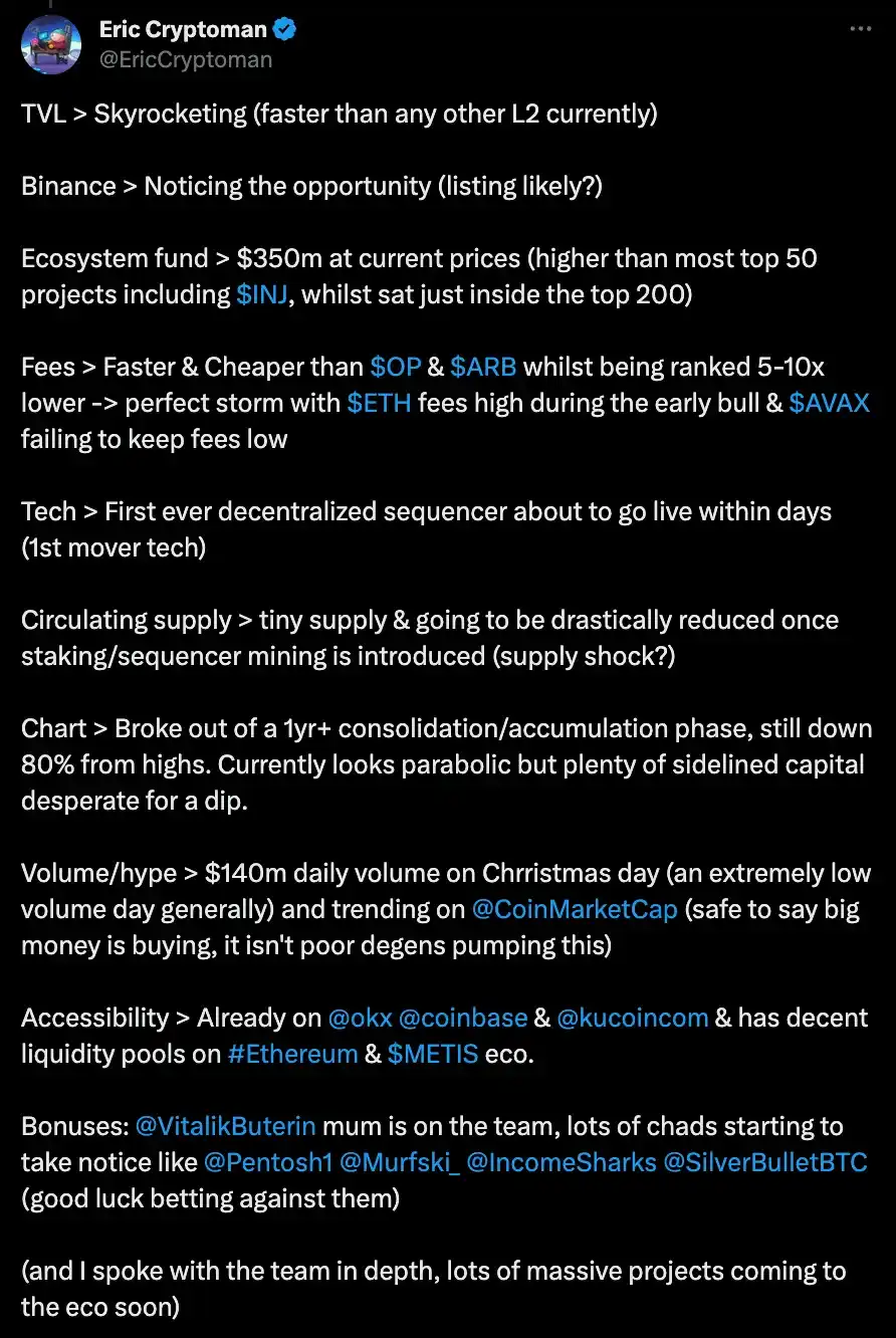 尽管如此,EDF(生态发展基金)的叙述,加上 Metis 是首批拥有去中心化排序器的 L2 之一,可能意味着至少在 2024 年的前几个月内,人们的关注会集中在 Metis 上。