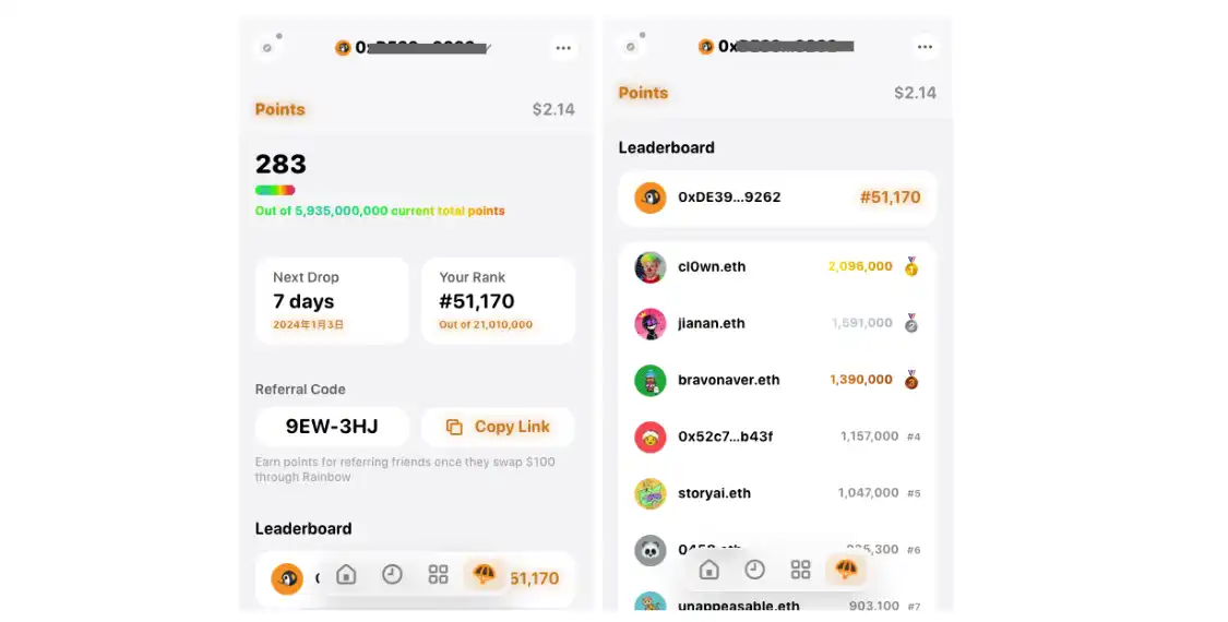 除了使用 Rainbow 进行跨链交易外,用户还可以通过传播邀请码来获得积分,除了推荐成功带来的额外积分外,用户还会将获得被推荐者已获得积分的 10%。每周赚取的积分将于每周二下午 4:20(UTC-5)空投给用户。