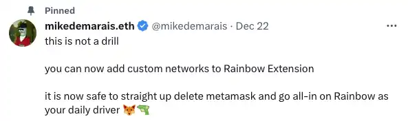 12 月 22 日,Ranbow 的联合创始人 Mike Demarais 发布了一条推文,表示「这不是演习,现在可以安全地直接删除 MetaMask 并全力以赴地使用 Rainbow 作为您的日常驱动程序」,「猎狐行动」会有何成果? 将持续关注。