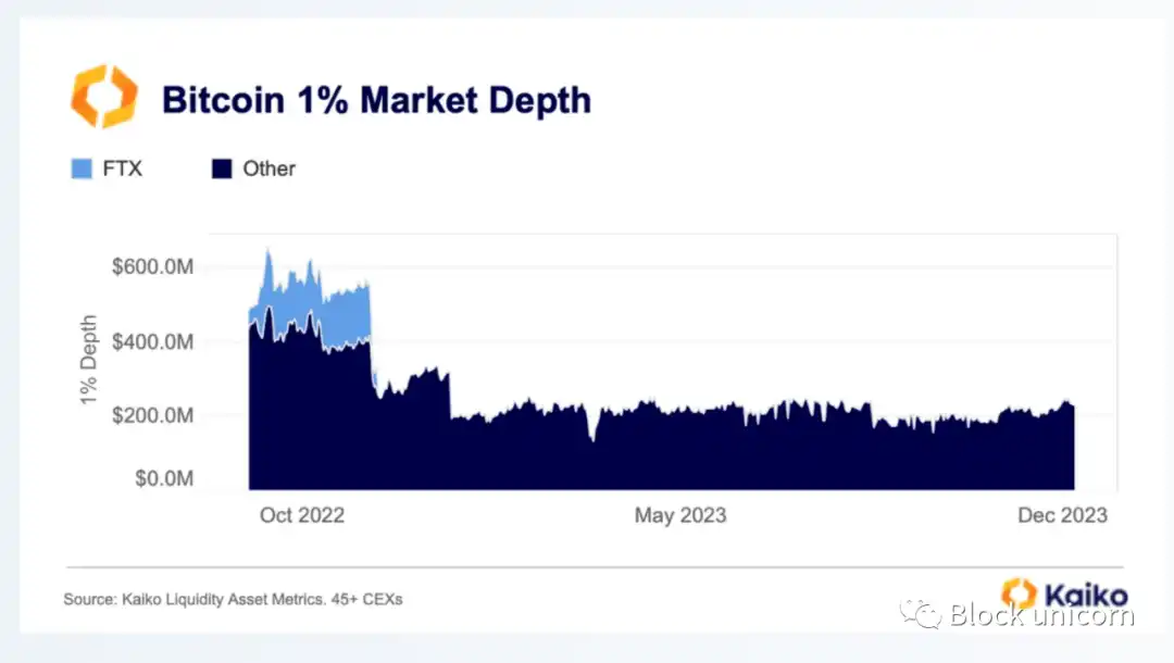 FTX 的崩溃导致比特币市场深度大幅下降,不仅 FTX 的突然消失实质上减少了流动性,而且由于巨额损失和困难的市场环境,市场做市商还在许多交易所上关闭了头寸。1% 市场深度,即在价格 1% 范围内订单簿上的买卖数量,已经从在所有交易所和交易对中约为 580 亿美元下降到仅约 230 亿美元。