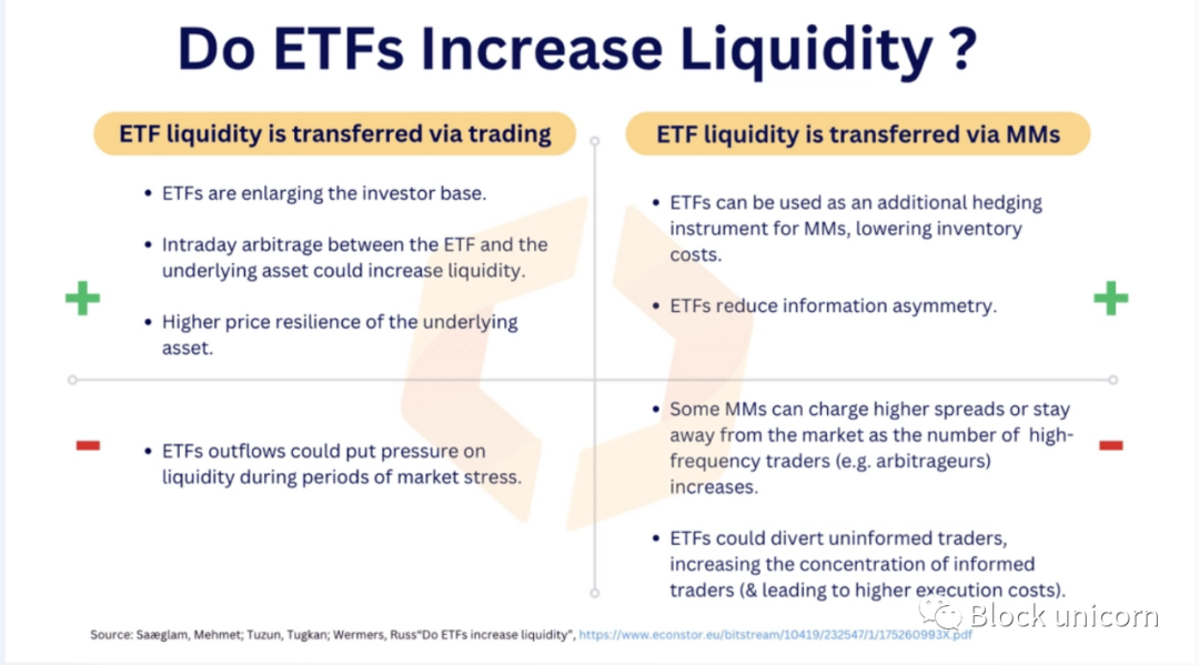 在「ETF 将提升流动性」的一方,有令人信服的论点认为,ETF 将扩大加密货币交易者的数量,导致交易量更大且市场更为高效。市场做市商也将受益于 ETF,作为对冲的同时可能会扩大其活动范围。