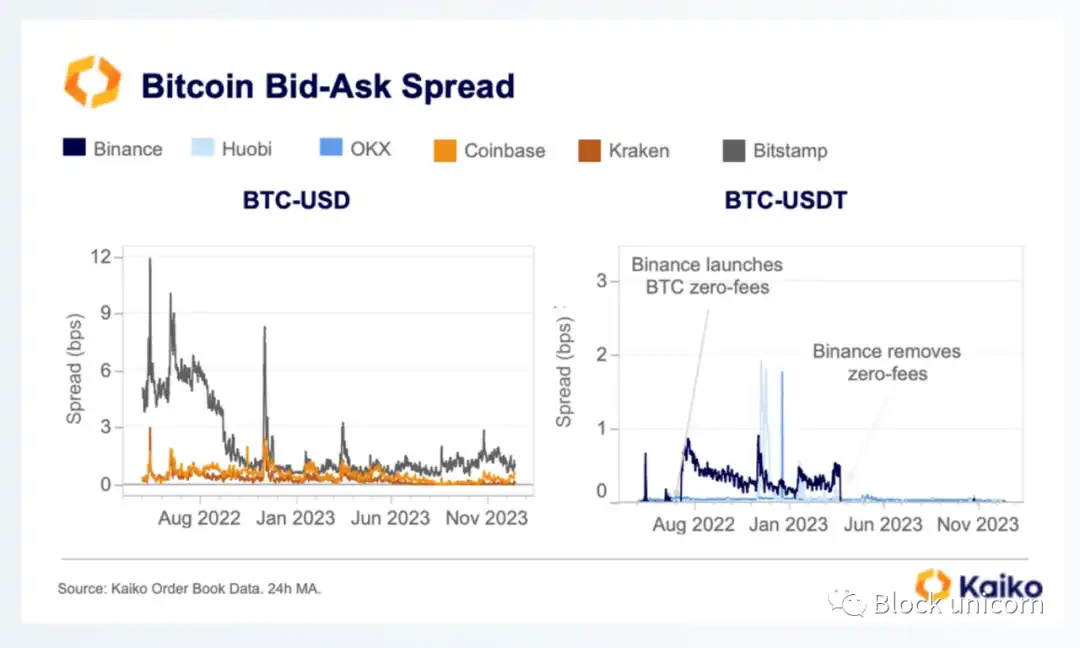 ETF 的批准还可能影响交易成本,因为更多知情的投资者进入比特币市场。在过去的一年中,交易者的成本,以点差的形式,自去年以来大多有所改善,可能是由于价格波动较低。