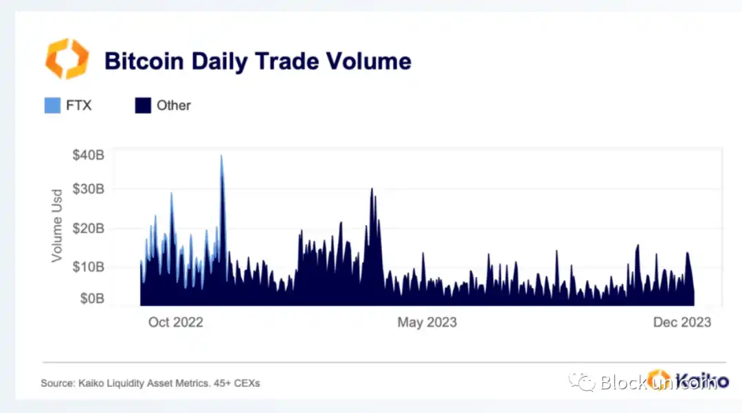 相较于市场深度,FTX 对交易量的影响要小得多,仅占全球交易量的不到 7%。自去年 11 月以来,交易量出现了相当大的波动。在 2023 年的前三个月,交易量保持较高水平,然后在三月银行危机后暴跌,达到了夏季的多年低点。