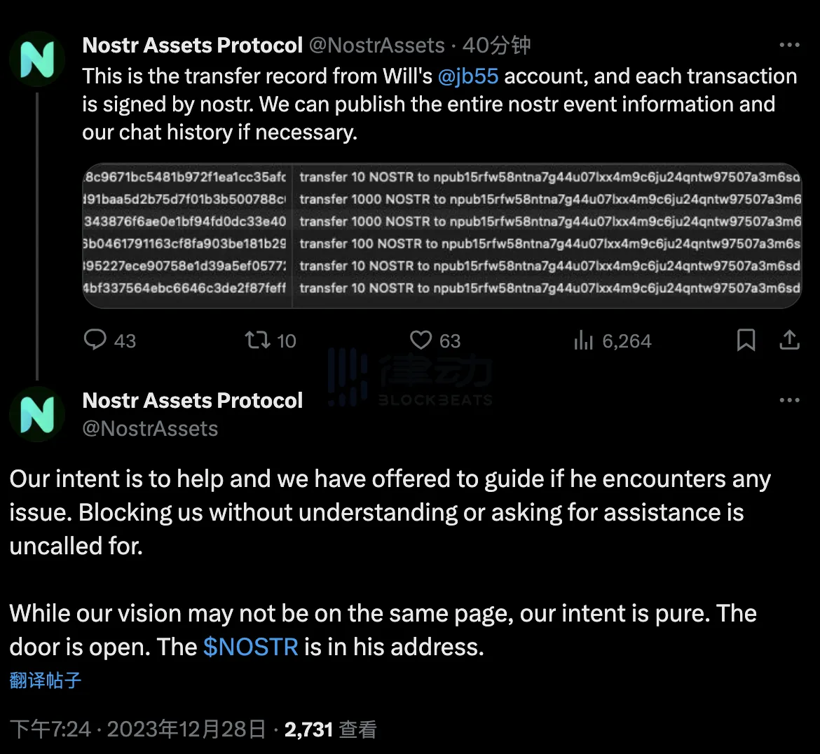 针对 Damus 首席执行官 William Casarin 拒绝接受捐赠并称其密钥已被列入黑名单、被锁在网站外无法转移其收到的代币的指控,Nostr Assets Protocol 进行了回应。Nostr Assets 显示了从 Will 的 @jb55 账户进行的转账记录,并强调每一笔交易均由 nostr 签名确认。为表透明,Nostr Assets 表示愿意公布完整的 nostr 事件信息和双方聊天记录。