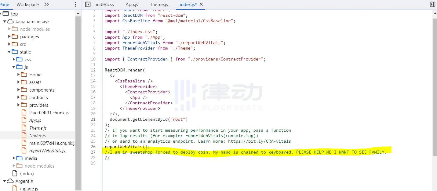 据加密 KOL Charlemagne 爆料,Solana 生态 DeFi 项目 Banana Miner 的协议代码中包含多条疑似求救信号的注释语句,内容包括「我不得不开始这个新项目,压力很大」,以及「我在血汗工厂被迫部署代币。我的手被锁在键盘上。请帮帮我,我想见家人。」(I am in sweatshop forced to deploy coin. My hand is chained to keyboared.PLEASE HELP ME I WANT TO SEE FAMILY.)