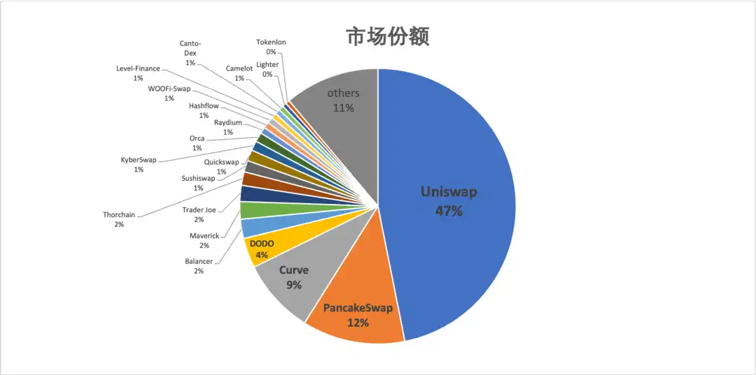 TOP 20 的 DEX 市场份额排名如饼图所示,这些 DEX 约占总 DEX 市场分额的 89%。Uniswap 以 47% 在今年保持了他头部玩家的优势地位,整体 DEX 保持了「梯队分层」的格局。