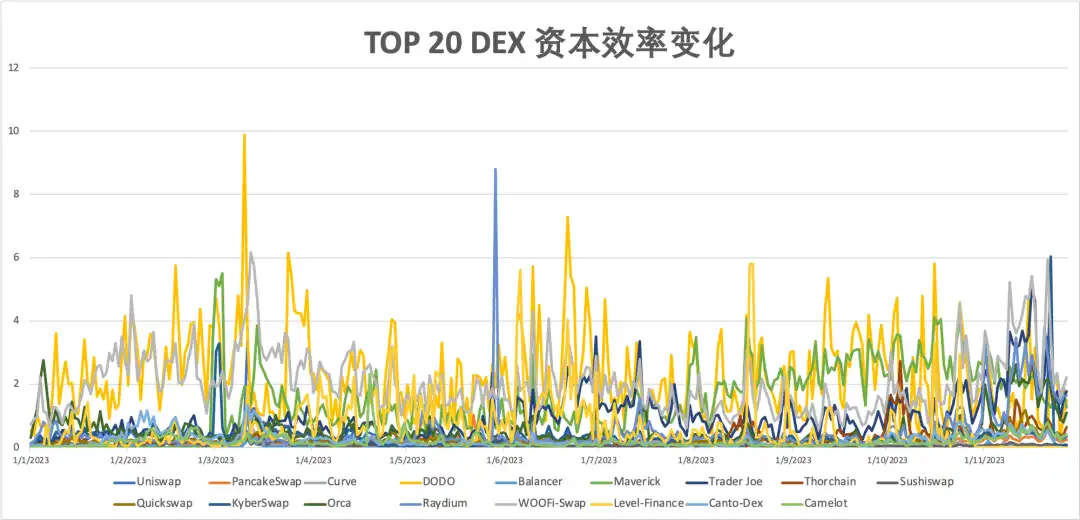 从单个 DEX 的资本效率来看,黄色线 DODO 在全年领先市场,年初仅灰色线 Curve 与之保持活跃。下半年自 8 月份开始,绿色线 Maverick 异军突起,在大盘震荡期间表现出色。