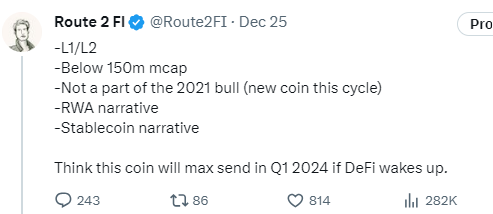 对我来说,是 INJ、SUI、SEI、FTM、CANTO(再次)和 Monad(于 2024 年推出)。可能还会有更多尚未推出的 L1 将会疯狂运行。」在这里睁大眼睛。