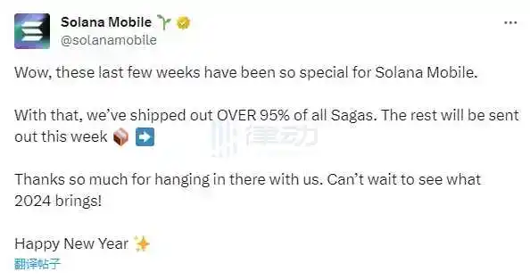 1 月 1 日,据 Solana Mobile 披露最新数据称,过去几周对于 Solana Mobile 来说非常特别,截至目前 Saga 手机已交付了超过 95%,剩下需要交付的手机将在本周内发出。