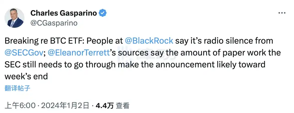1 月 2 日,据 Fox Business 记者 Eleanor Terrett 和 Charles Gasparino 透露,尽管 SEC 的行动难以预测,但考虑到 SEC 仍需审查上周四和周五提交的 S-1 表格并对其进行评论,本周初批准的可能性不大。Terrett 指出,根据她与发行人的交流,SEC 可能会在本轮审查后通知发行人最终提交 S-1 表格的日期,并在随后的 24-48 小时内使之生效,类似于去年 10 月以太坊期货的审批时间线。 同时,Charles Gasparino 从贝莱德集团(BlackRock)获悉,目前该机构尚未从 SEC 那里获得任何消息。