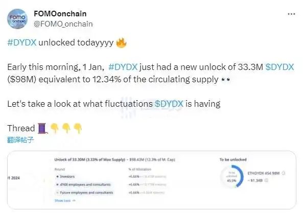 数据:dYdX 于今晨解锁价值 9800 万美元代币,部分已转入 CEX