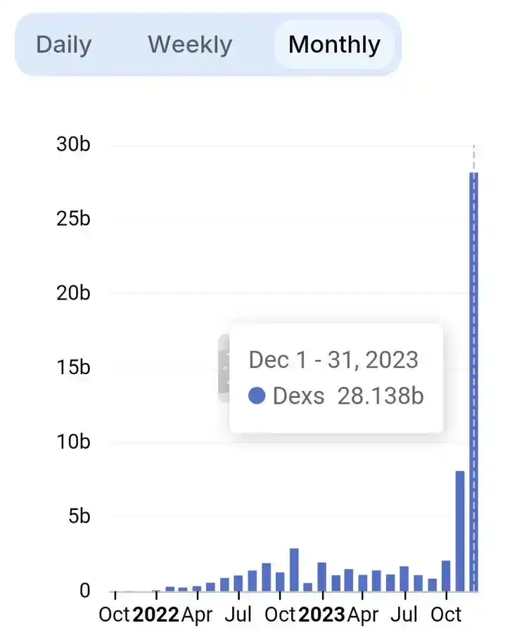 1 月 1 日,据 DefiLlama 数据,2023 年 12 月,Solana 生态 DEX 交易量超过 280 亿美元,创历史最高月度交易量。