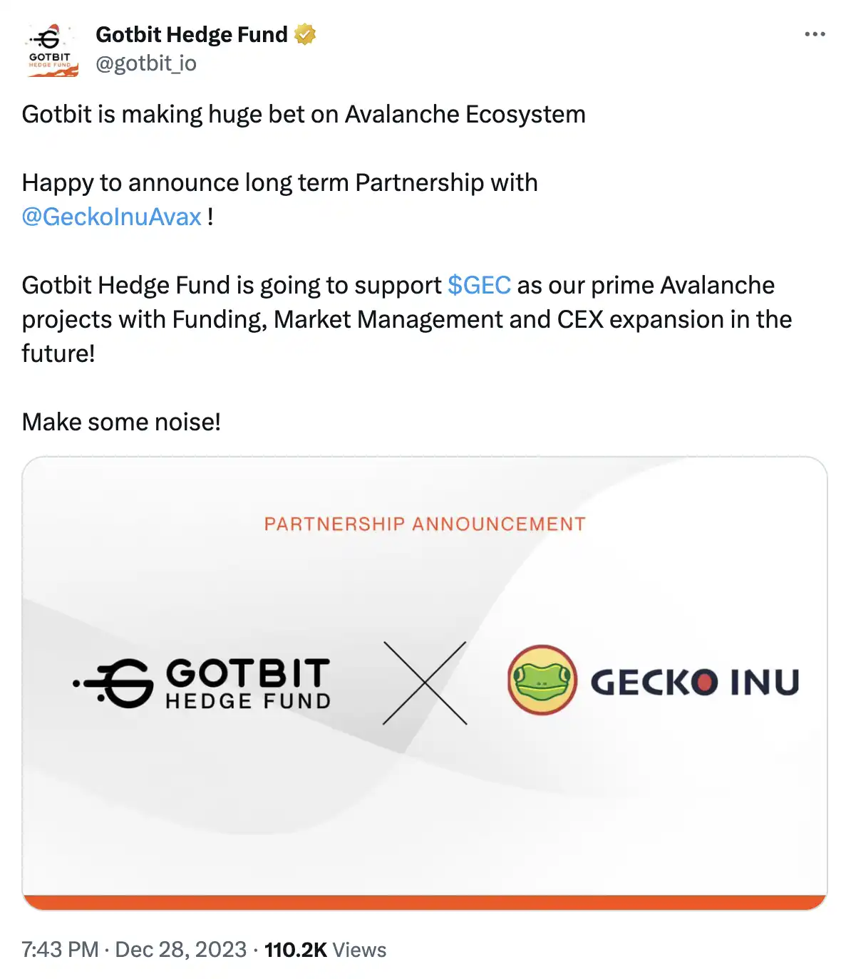 GEC 是 Avalanche 上的蜥蜴 meme,2023 年 12 月 21 日部署,其目的是让 AVAX 再次伟大。12 月 28 日,有着 meme 币 DWF 之称的做市商 Gotbit 宣布与 GEC 合作,随后 GEC 于 12 月 31 日达到历史新高 0.000000618 美元。据 DEX Screener 数据,截至撰稿时,GEC 价格为 0.000000086 美元,24 小时跌幅达 59.6%。