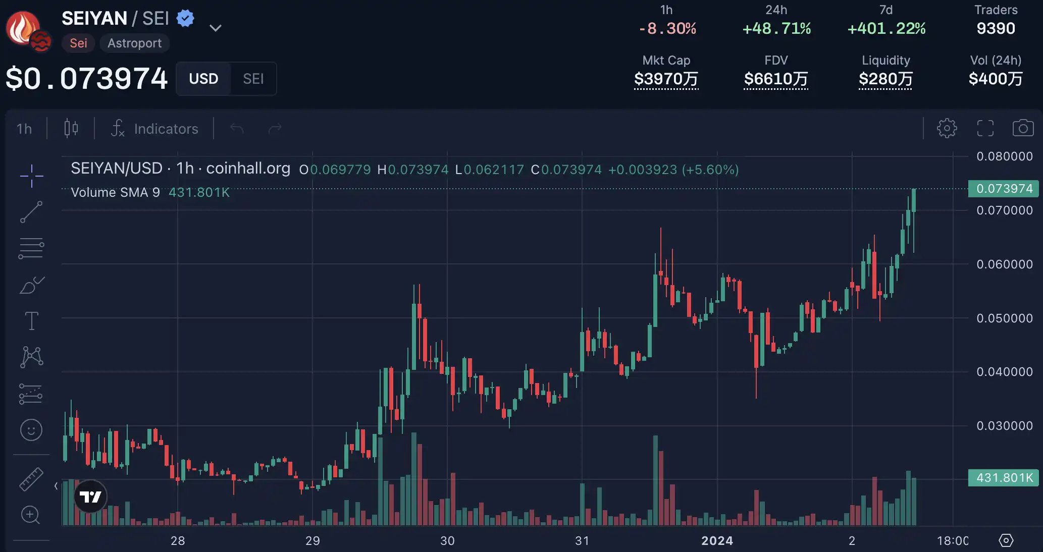 SEIYAN 是 Sei 上的一个赛亚人概念 meme,因为 Sei 的联合创始人 Jay 的社交媒体账号头像为赛亚人。Sei 的价格在近期获得不小涨幅,走势强劲,今日更是突破历史新高,截至发稿前,Sei 价格为 0.76 美元,7 日涨幅达 28%。而 meme 作为涨幅放大器,SEIYAN 目前价格为 0.073 美元,7 日涨幅达 400%。
