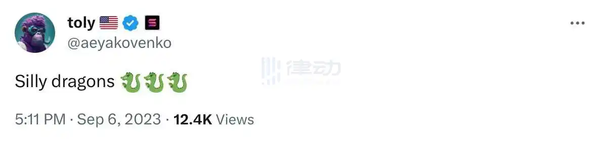 Solana 这一轮崛起,meme 币功不可没,而 SILLY 是其中在知名度与财富效应上最有存在感的 meme 之一。Silly Dragon 最早可追溯到 9 月 6 日。那一天,Solana 联创 Anatoly 在社交媒体上发布了一条神秘的信息,仅仅三个青龙表情伴随着两个字:「Silly dragons(傻龙)」。