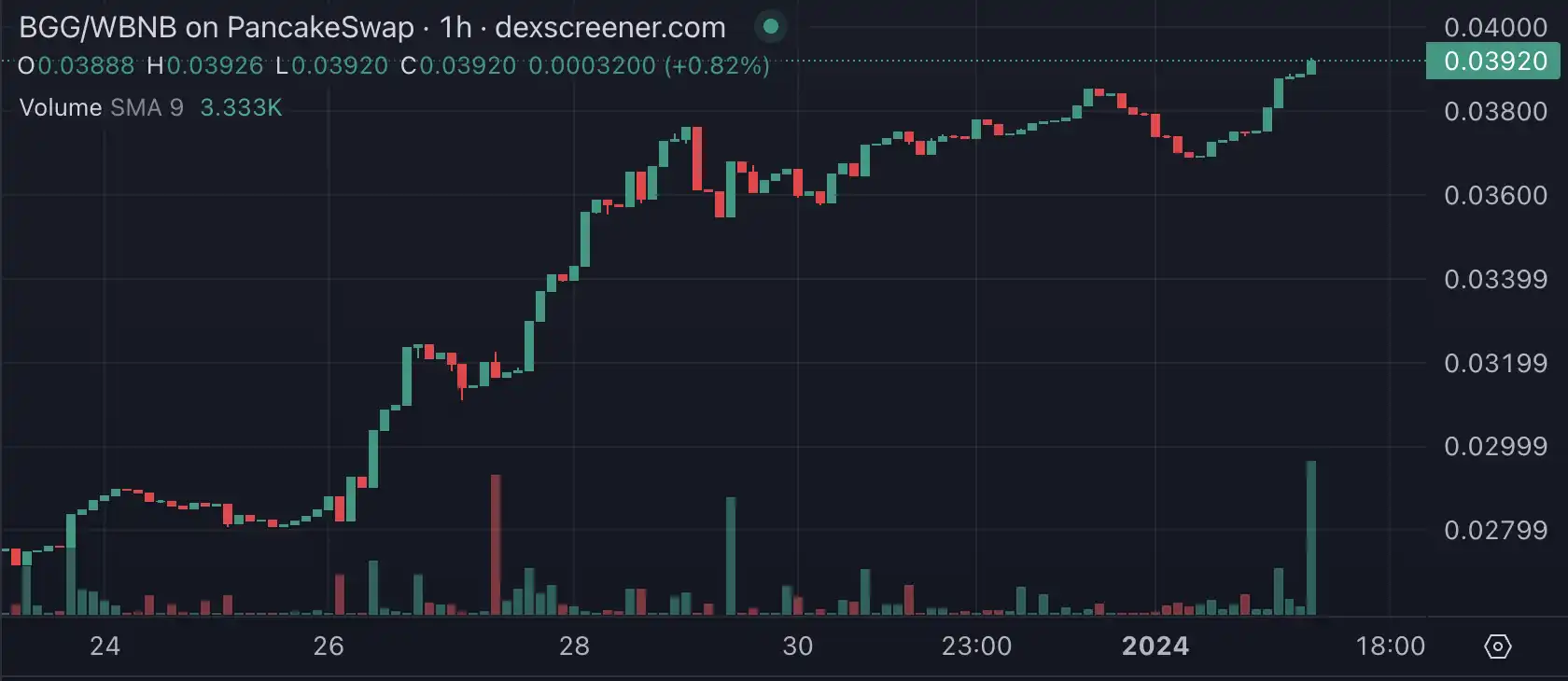 据 DEX Screener 数据显示,截至发稿前,MDS 价格为 0.011 美元,24 小时跌幅为 0.4%。BGG 市值和 FDV 均为 3890 万美元,价格为 0.038 美元,24 小时涨幅为 4.65%。