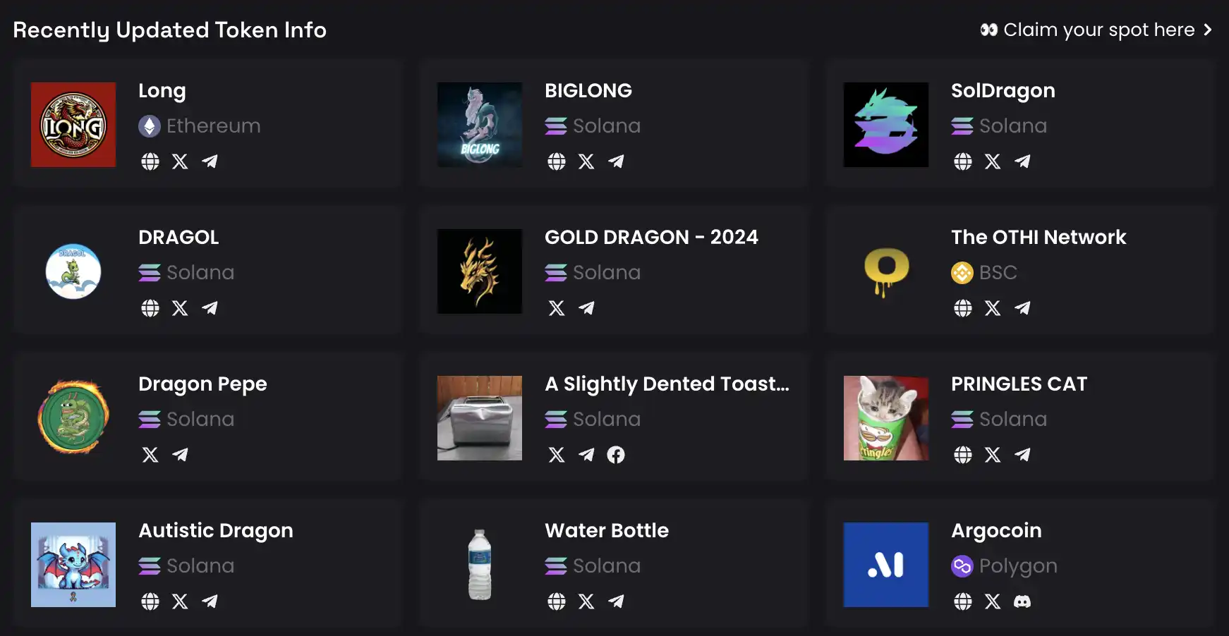 而随着正式进入 2024 年,越来越多的和龙相关的概念标的涌现,仅在 2024 年 1 月 1 日,DEX Screener 的新币板块首页就出现了 6 个从名称上就能一眼辨认出的龙概念。