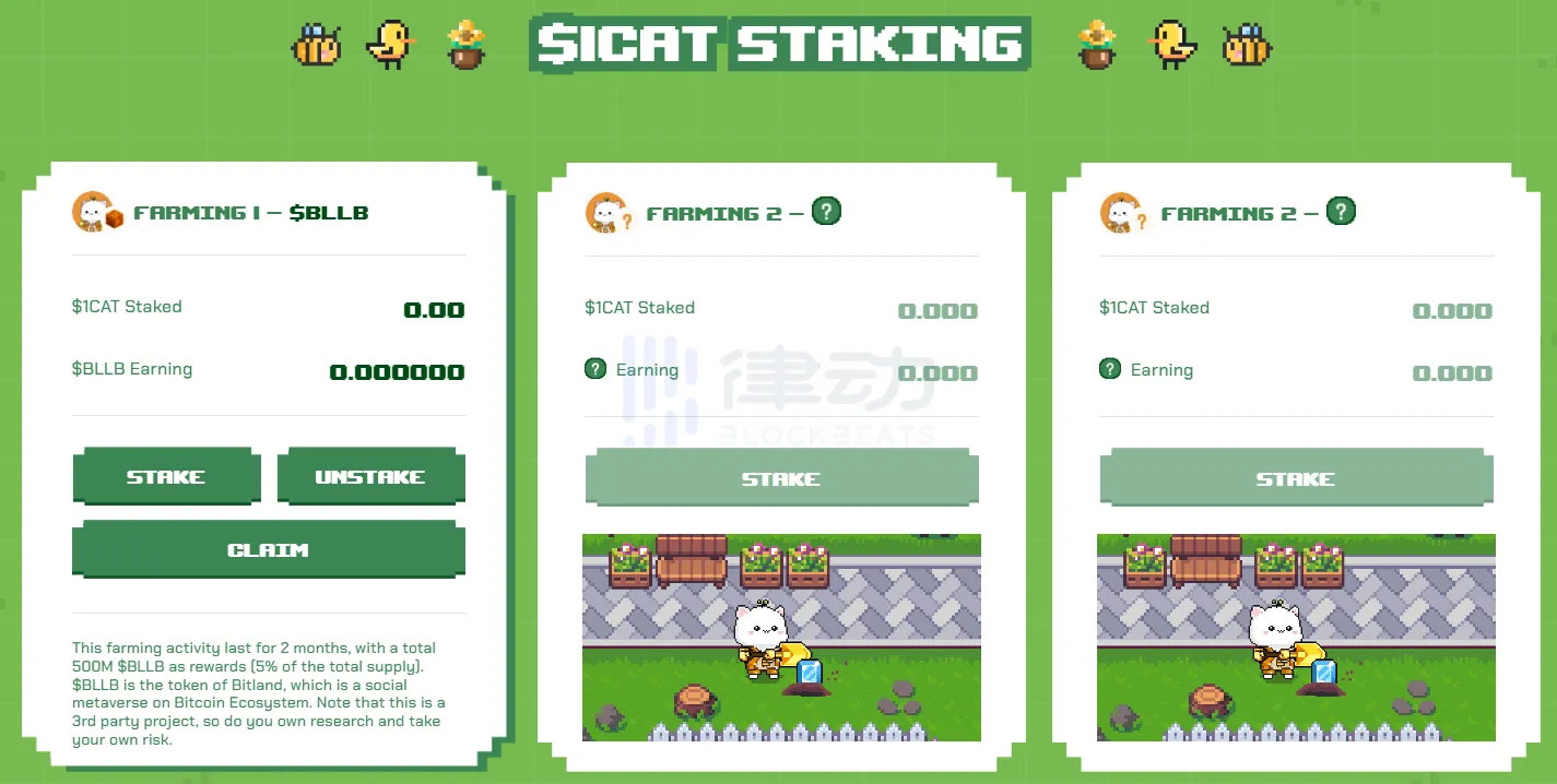 铲子套娃也开始了。12 月 25 日,Bitcoin Cats 宣布推出「1CAT 金铲计划」,参与者可通过质押 1CAT 代币来赚取生态系统合作伙伴的代币,在 BakerySwap 之后 Launchpad 上线的两个项目中,用户都可以通过 BAKE 和 1CAT 代币进行参与,1CAT 不仅是 Bitcoin Cats 游戏中的主要资产,还将作为通往更广阔生态系统的「金铲」。