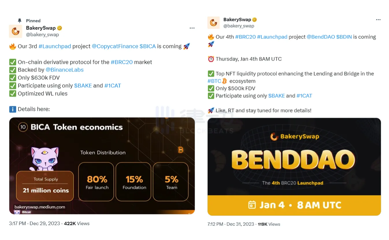 尽管已有质疑声出现,但平台还在继续,所推出的项目也「各有千秋」。12 月 29 日,BakerySwap 发布了第三期 Launchpad 项目介绍,此次项目为一周以前在 TurtSat 上被推迟发售的 CopycatFinance。而紧随其后的是 NFT 借贷流动性协议 BendDAO,创立于 2022 年、TVL 曾突破 3 亿美元,其在近期宣布将拓展比特币生态。