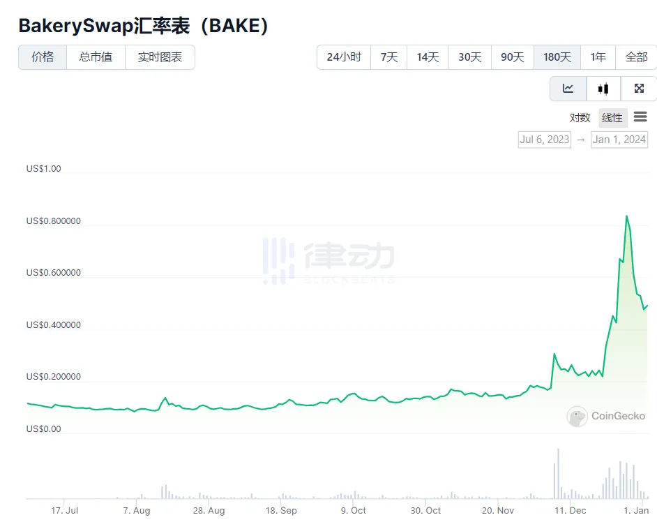 通过参与比特币生态项目的 IDO 而「一举成名」的,除了 Bounce Brand,还有 BSC 生态的 AMM BakerySwap。在 12 月之前,BAKE 在 2023 年间的价格不超过 0.3 美元,而从 12 月 19 日到 26 日,一周时间,三个 IDO 项目让 BAKE 实现「三连跳」,周涨幅突破 300%。
