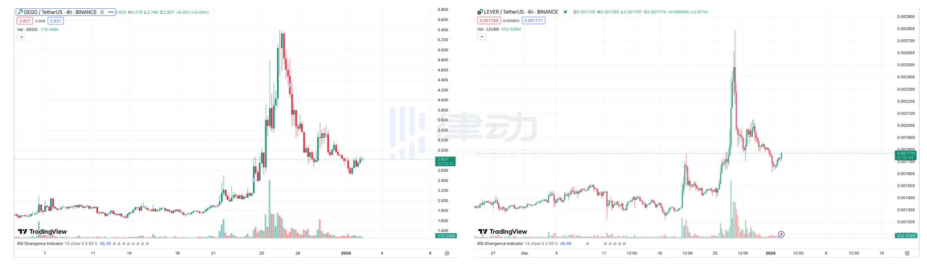 紧随的是去中心化杠杆交易平台 LeverFi,其在 12 月 27 日宣布推出 BRC20 Launchpad 平台 LeverPro,平台将推出三个项目,重点关注抵押稳定币、BRC20 资产借贷以及 AMM 互换和流动性挖矿赛道协议。消息公布后,LeverFi 原生代币 LEVER 24 小时涨幅超过 50%,然后迅速回撤。