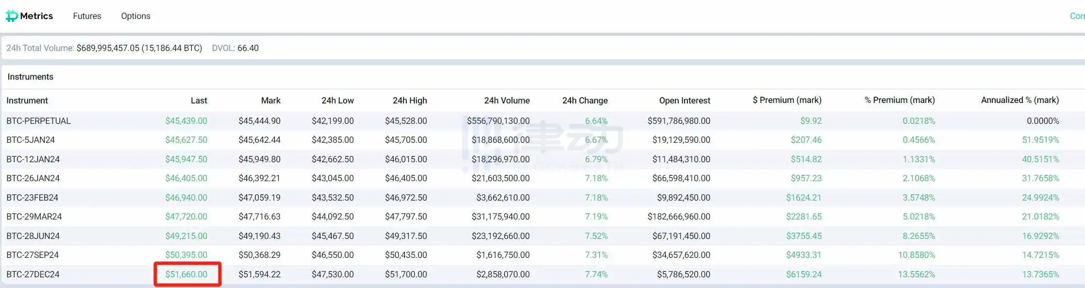 据 Deribit 数据显示,比特币 2024 年年底期货价格已升至 51,660 美元,较当前溢价 13.7%。而上周末时,该价格还处于 47,000 美元水平。