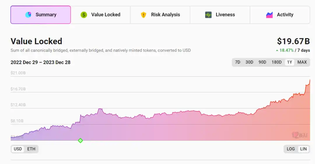 在 2022 年市场行情差强人意的状态下,唯独以太坊 layer2 在年底经历了一个爆炸性的增长阶段,成为延续到 2023 年上半年的主要看点,尤其是龙头 Arbitrum 的领先发展。根据 L2beat 的数据,Layer2 的总价值锁定(TVL)目前达到了 201 亿美元(如下图所示),为这一阶段的熊市的 Builder 保留了发展空间。