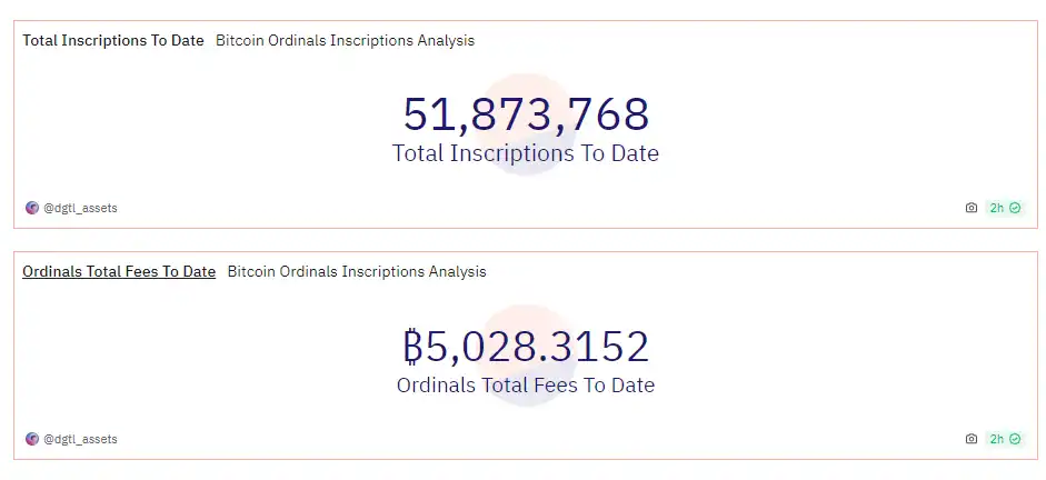 Ordinal 协议概述了一种对聪(比特币的最小单位 sat,代表比特币的一亿分之一)进行顺序编号的方法。一旦获得了 Sat 的序列号,用户就可以将数据刻录到这些 Sats 上以制作数字文物,这是 Rodarmor 相对于 NFT 的最初描述。截至 2023 年 12 月 27 日,Ordinals 铭文铸造累计费用达到 5028 个 BTC。