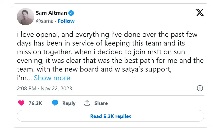2023 年 11 月 18 日,OpenAI 通过其官网宣布现任 CEO、被誉为「ChatGPT 之父」的 Sam Altman 将辞去首席执行官职务并离开董事会,消息一出,随后大量员工宣布将与他同进退,也选择离职,消息突如其来,随后他又宣布了令人震惊的消息,表示将携助理加入微软。然而,再次反转的是,在被开除五天后,Sam Altman 再次重新成为 OpenAI 的 CEO。