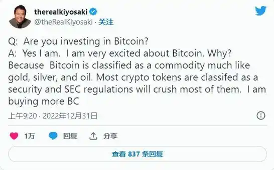 而且本月的喊单已不是 Robert 第一次推广比特币,Robert Kiyosaki 2022 年也曾发布推特指出,比特币几乎就像一种商品,更像是黄金、白银或石油。其次,美国证券交易委员会还将比特币归类为商品,而其他加密货币则被视为证券。