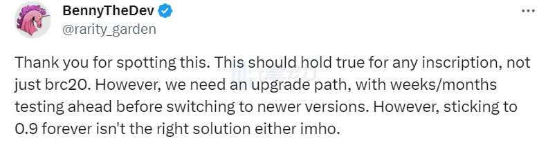 domo 的态度在本文的开头已经提及。Best in Slot 更是在昨天发表推文称在 Ordinals 协议 v 0.13.1 版本中发现了一个会对 BRC-20 余额正确性造成影响的「严重漏洞」,强烈呼吁 BRC-20 索引将运行版本保持在 v 0.9.0 版本以维持协议稳定。Best in Slot 还在推文中表示,v 0.13.1 版本中很可能还存在其它影响 BRC-20 协议的 Bug,「稳定」是 BRC-20 的第一要务,已经体量庞大的 BRC-20 协议无法经受持续的、未经测试的升级。