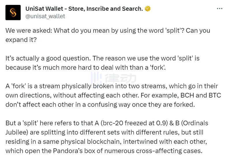 UniSat 用「分裂」来形容本次的分歧,而不是「分叉」。UniSat 指出,「分叉」是共识上的差异形成的物理意义上的「分道扬镳」,比如 BCH 和 BTC,实际形成了两条链,各自按照自己的共识互不影响地发展。而 BRC-20 的升级分歧可能导致的结果则是一个 BRC-20 协议在同一条链(比特币主网)上运行两套规则不同的索引,彼此依然会相互影响。