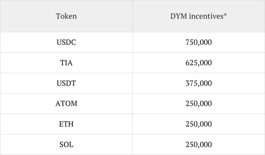 此外,Dymension 还将在主网启动后一周推出流动性激励计划,为跨链至 Dymension 的用户分配 250 万枚 DYM 创世空投,该计划支持的代币包括 USDC、TIA、USDT、ATOM、ETH、SOL。