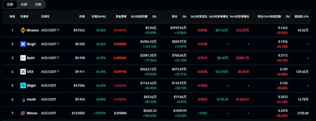 近 24 小时 ACE 在 Binance 的资金费率在 0.04–0.08% 之间,资金费率偏高,但近日全市场资金正费率现象较为明显,热度不错的代币资金费率大多在 0.04% 以上,代表了近日整个市场看涨的情绪较高。