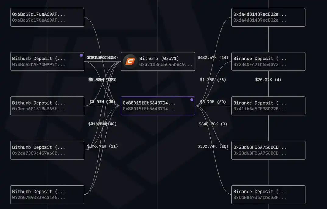 近 7 日 Binance 两钱包转出净流出 17.2w 枚代币,持币第二的地址 0x880 近 7 日净流入 14.4w 枚代币,该地址与 Bithumb 及 Binance 交易频繁,可能为做市商或交易所关联地址在积累筹码。